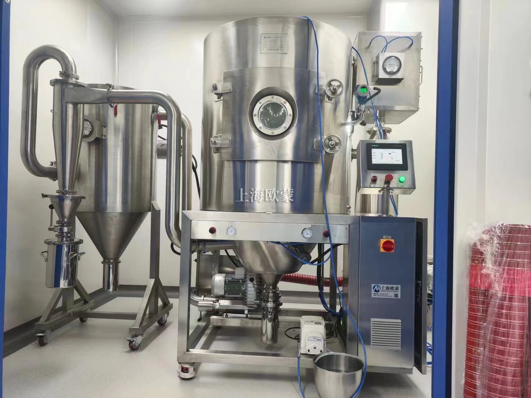 噴霧干燥機(jī)為開(kāi)式循環(huán),并流式,離心式霧化。干燥介質(zhì)空氣經(jīng)過(guò)初、中效空氣過(guò)濾器過(guò)濾后根據(jù)操作指令由鼓風(fēng)機(jī)吸取再經(jīng)加熱器加熱通過(guò)高效過(guò)濾器的熱風(fēng)分配器進(jìn)入噴霧干燥主塔。液體物料根據(jù)操作指令經(jīng)過(guò)蠕動(dòng)泵,進(jìn)入高速旋轉(zhuǎn)的離心噴頭,在離心力作用下被分散成小霧滴。在噴霧干燥主塔內(nèi),小霧滴與熱風(fēng)在充分接觸,沿其特定路徑進(jìn)行熱交換后被干燥成為產(chǎn)品,然后通過(guò)旋風(fēng)分離器實(shí)現(xiàn)分離,固體物料被收集,氣體介質(zhì)再經(jīng)過(guò)過(guò)濾后被排出。整套噴霧系統(tǒng)易清潔、無(wú)死角,符合GMP要求。
