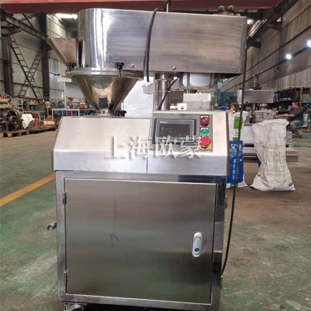 本機有送料機構(gòu)、壓片機構(gòu)、液壓機構(gòu)、機架和電氣控制等部件組成,送料,壓片、制粒均采用變頻無級調(diào)速,油泵壓力可調(diào),成品細(xì)度可以通過更換不同的篩網(wǎng)獲得。改進制粒轉(zhuǎn)籠,增加了顆粒的成品率。本機裝拆、清洗方便,與物料接觸部分皆為不銹鋼制作。產(chǎn)品符合GMP要求。物料由頂部送料漏斗加入,經(jīng)兩壓輪強制擠壓成片狀后進入下部制粒室,在制粒室中片狀物料被制粒刀片打碎,然后進入整粒室,直至顆粒小于或等于網(wǎng)孔徑,顆粒通過網(wǎng)篩到盛料托盤。所需要顆粒大小可以通過調(diào)整篩網(wǎng)大小來決定。