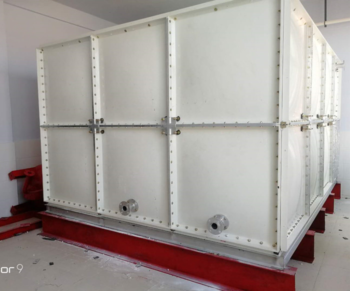 3:安裝底板:根據水箱板上的印號和說明,排列,兩張單板之間添加密封膠條,螺絲連接連接底板,使其密封牢,螺絲加力時要加力均勻,每個螺栓加力3-4次,不得用力過猛,否則會因用力不均勻造成裂板現象。用固定角鐵連接底板和槽鋼,使水箱箱體固定在水箱基礎上。
